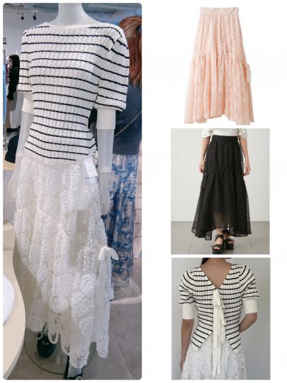 スカートが大人気♡ カラーによって柄が異なるデザインで、透け感のあるチュール生地2枚と裏地1枚の3枚仕立て。アシンメトリーに配置された左右のリボンも特徴です。お手持ちのシンプルなトップスを合わせるだけでサマになりますが、オススメはヌケ感のあるバックシャンタイプ。