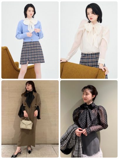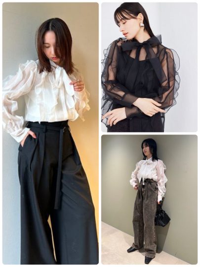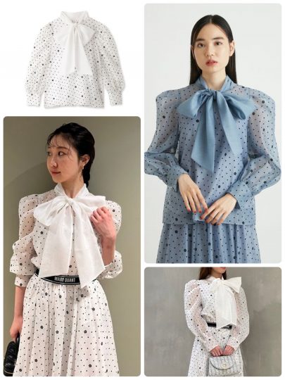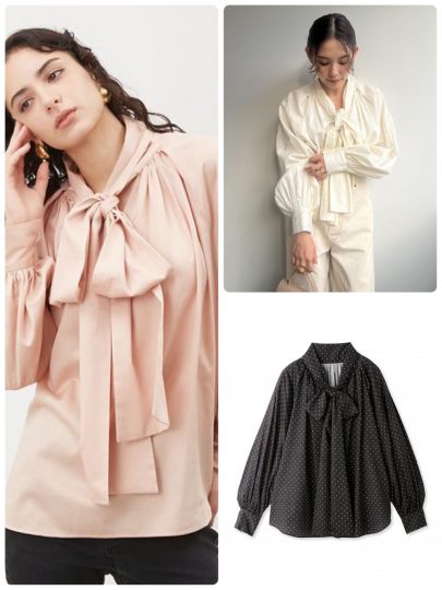 クラシカルな雰囲気のブラウスに、気品溢れるボウタイをプラス。ふんわりと仕上げたボリュームスリーブが二の腕カバーも叶えてくれます。