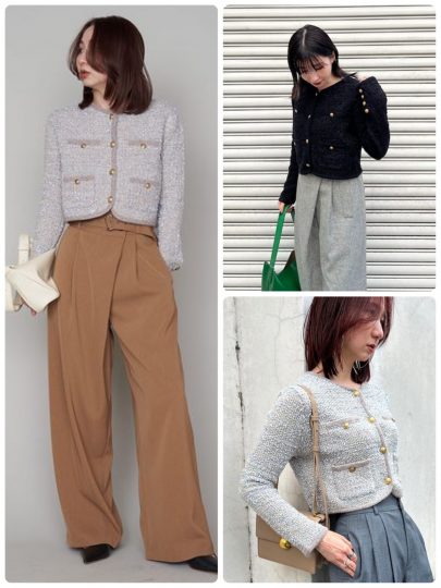 肉厚な素材で仕立てていて、カーディガンとジャケットの中間のような感覚で着用できます。きれいめなMIXツイード×金ボタンで品の良い印象に。スカート、パンツどちらとも相性◎で幅広く活用できそう。