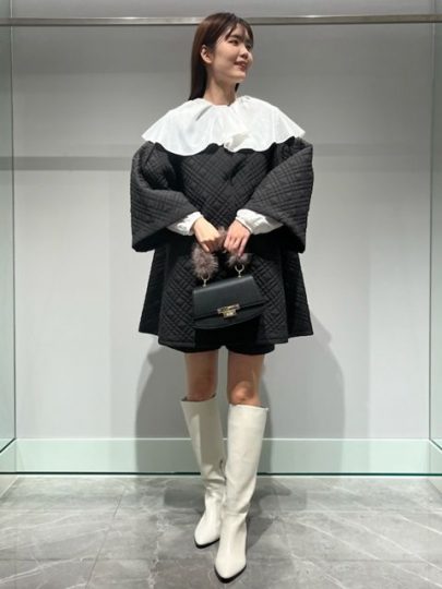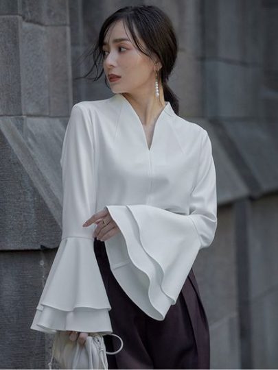 袖口の2重に重なったボリュームのあるベルスリーブが、女性らしいシルエットをメイク。少し反り上げた首元のデザインが、フェミニンな中にモードなエッセンスをプラスしてくれます。肉感のあるダブルクロス素材を使用しており、安心感のある着心地。