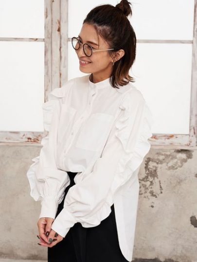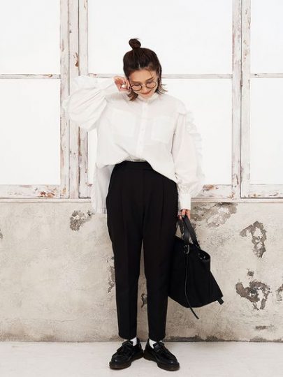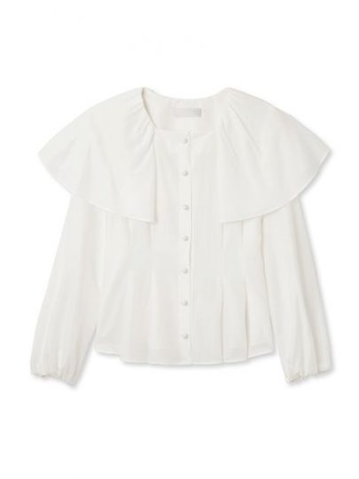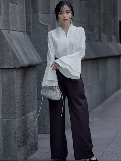 前後から見える袖のダブルラインフリルが目を惹く一枚。ハリ感のある生地の程よいボリューム感がトレンド感を楽しめて、二の腕のカバーにもなってくれるのが嬉しいポイント。ノーカラーの襟とスッキリしたシルエットがフリルを引き立てて、いつものコーディネートをアップデート!