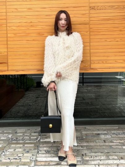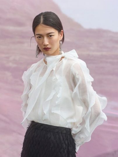リュクスな肌見せとエレガントな陰影が美しいシアーブラウス。表情のある風合いと