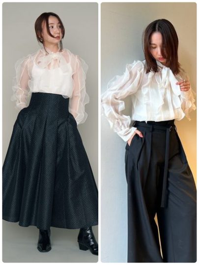 透明感が際立つシアーブラウスは、全体に施したフリルでデコラティブに仕上げ、クチュール感あふれるデザインに。襟元には取り外し可能な2WAYボウタイリボンをセットし、気分に合わせたスタイルチェンジが可能に。インもアウトもできるジャストな丈感で、パンツにもスカートにも対応。
