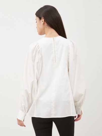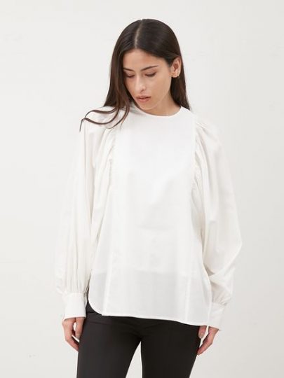 アームホールからたっぷり広がるギャザーパフスリーブが、スタイリングの主役になるブラウス。裾はインしやすいラウンドヘム。デニムやテーパードパンツなどを合わせて、甘さを引き算したスタイリングがおすすめです。