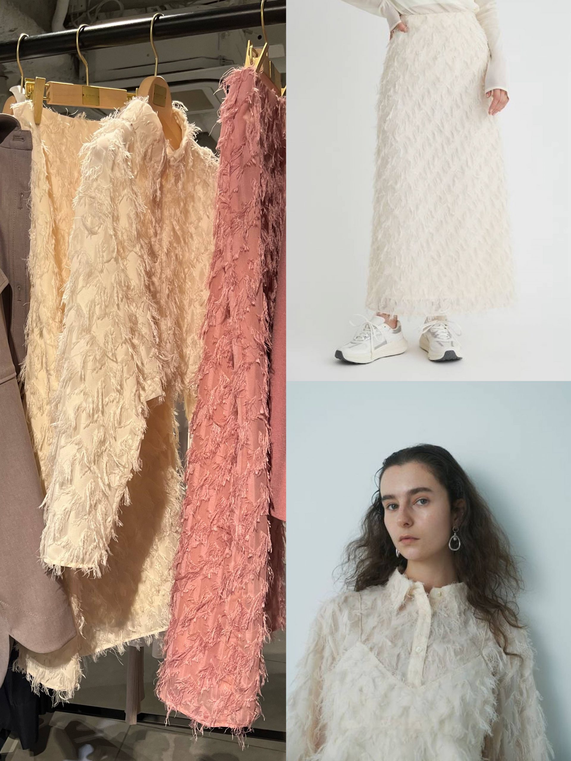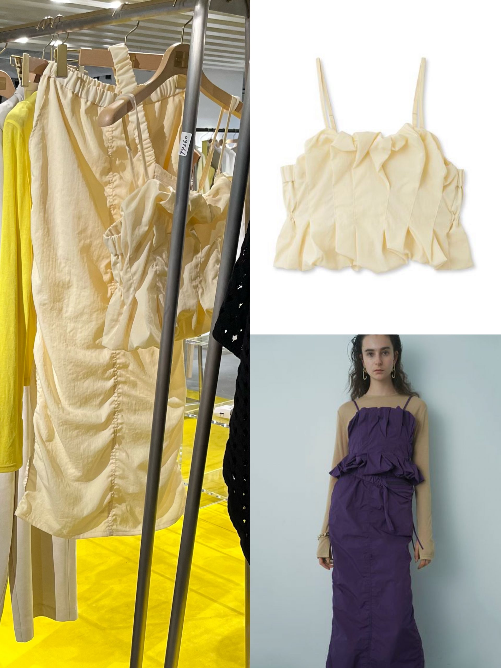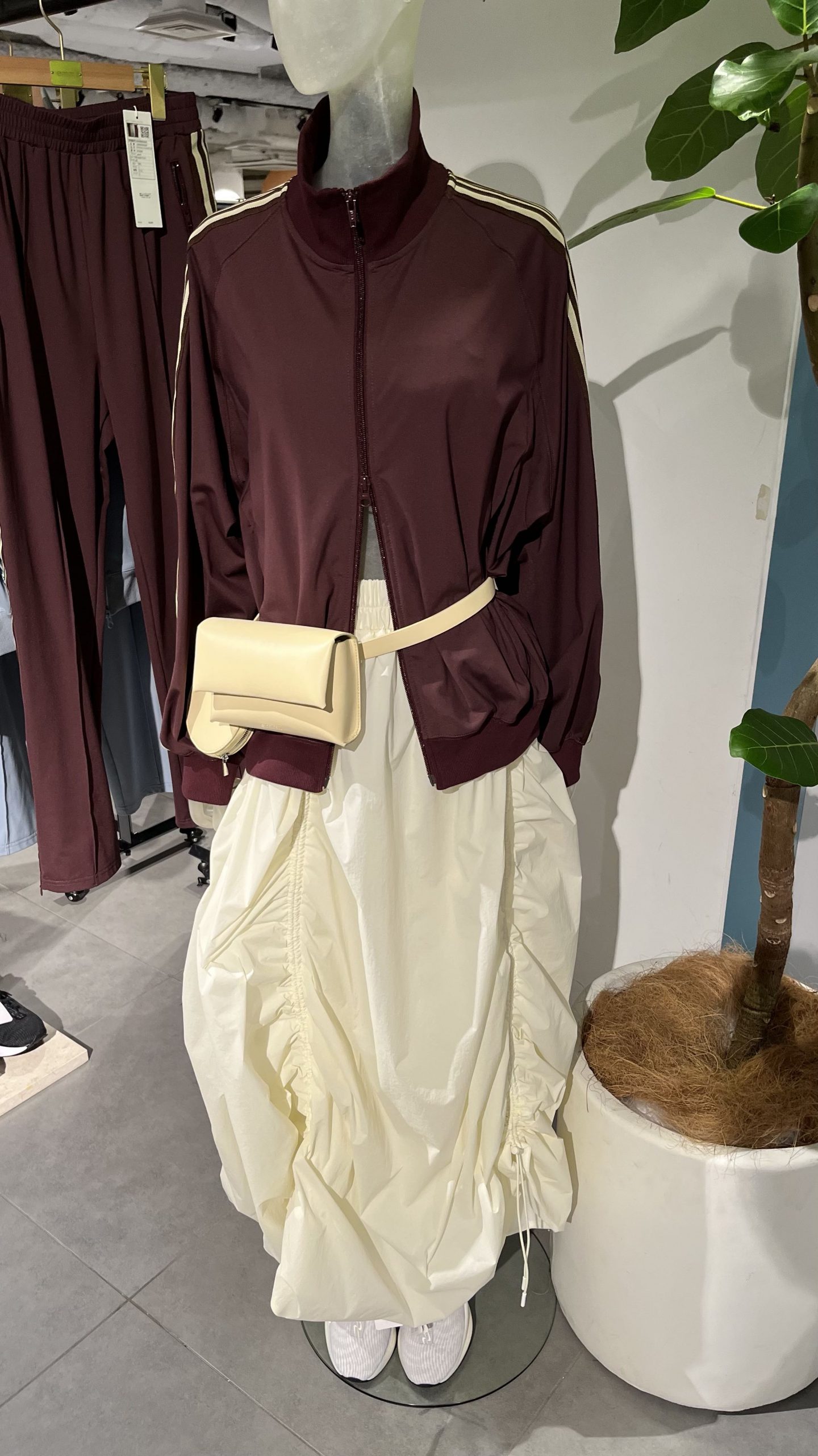 展示会でも目を引いていた、スポーティなコーデがこちら。トップスはトレンドのミニマムなトラックジャケット+スカートはemmiらしいロングのボリュームスカート。コーデごとぜひ真似したい!