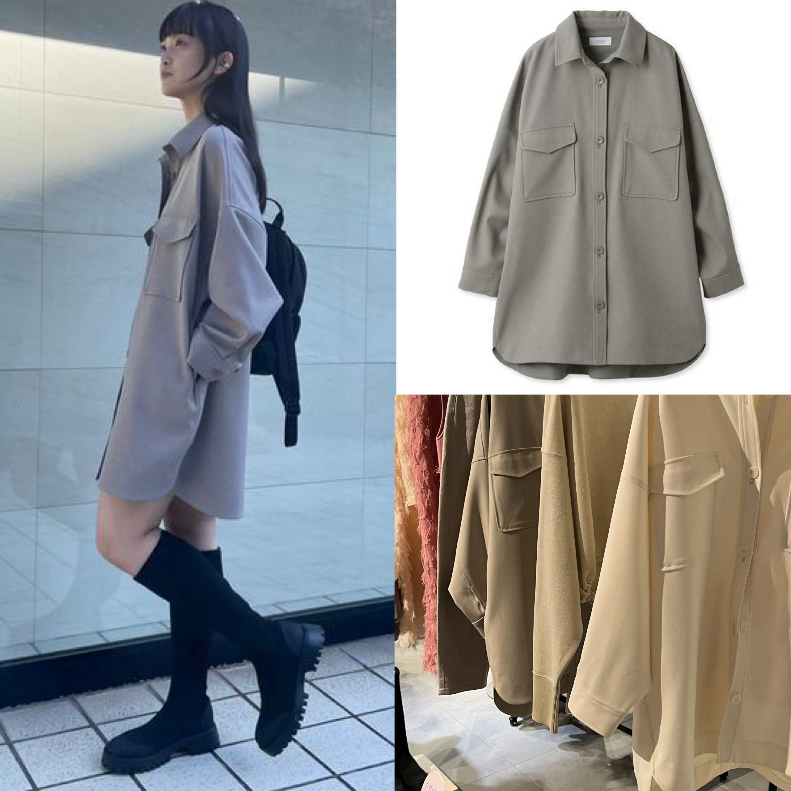 彼氏のシャツ風なビックシルエットのCPOジャケット。春はぜひ前をしめた、ワンピースとした着こなしにトライしたい。ビックシルエットCPOシャツジャケット /emmi atelier