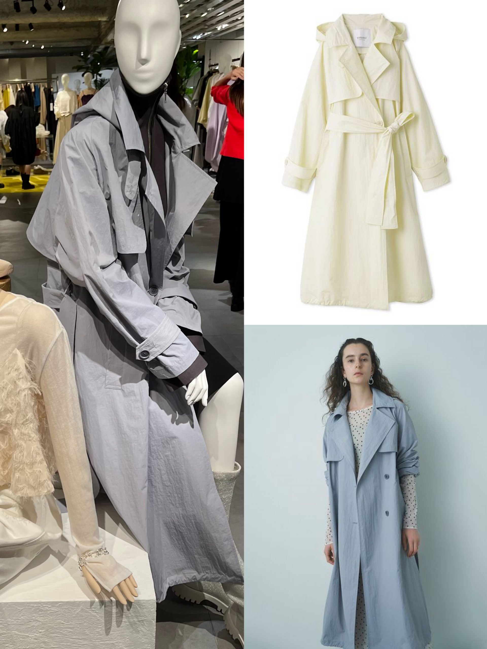 フードの取り外しができる、ロングトレンチ。襟が大きめなのもポイントで、袖をモデルさんのようにキュッとまくってインナーを見せる着方もおしゃれ。嬉しい撥水加工。2wayトレンチコート /emmi atelier