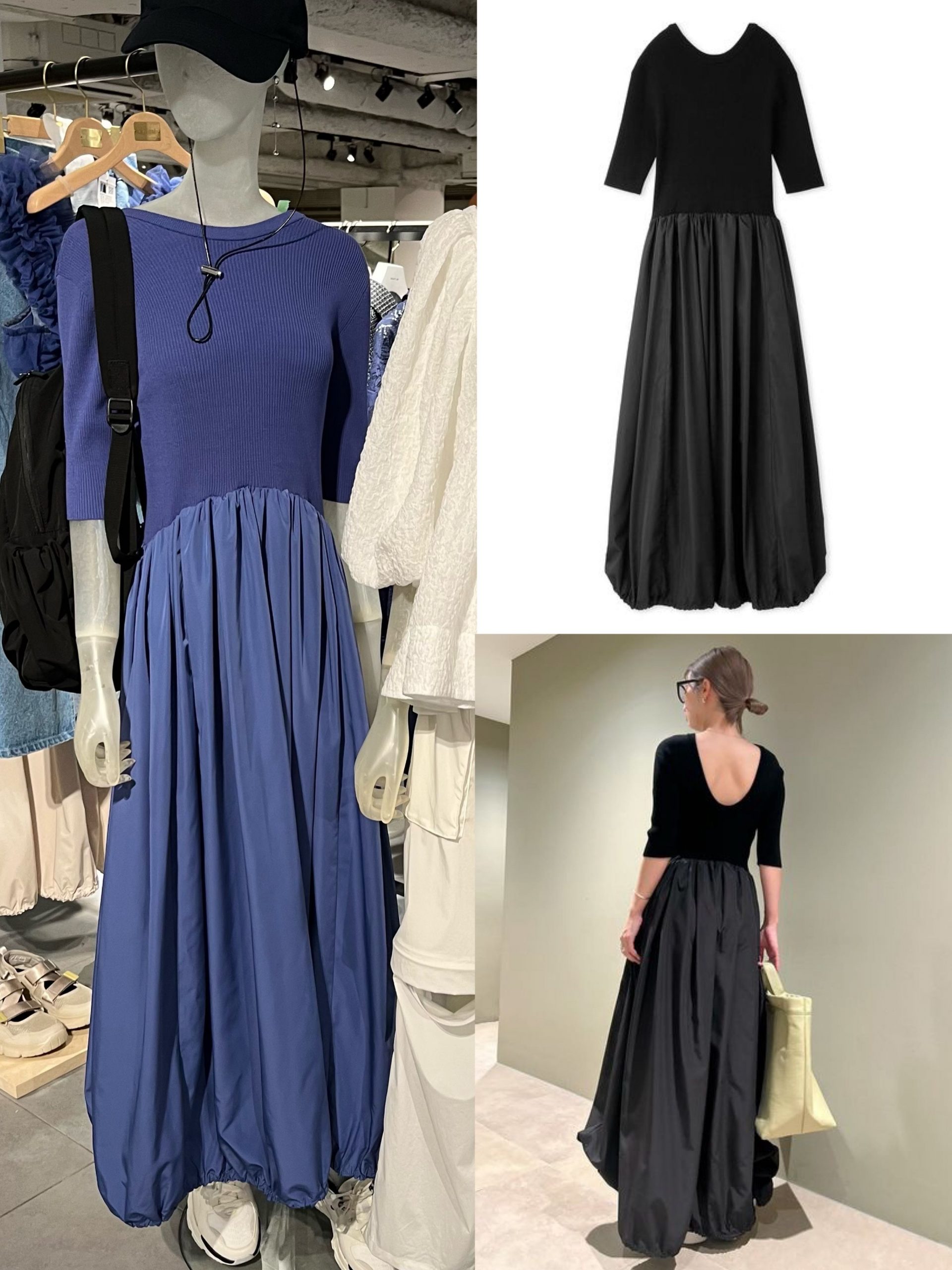 ニットとタフタがドッキングした、emmiお得意のフェミニンワンピース。背中が広めに開いているのがポイントで、スカート部分の裾はドロスとでバルーンにしたりもできます。ニットドッキングタフタワンピース /emmi atelier