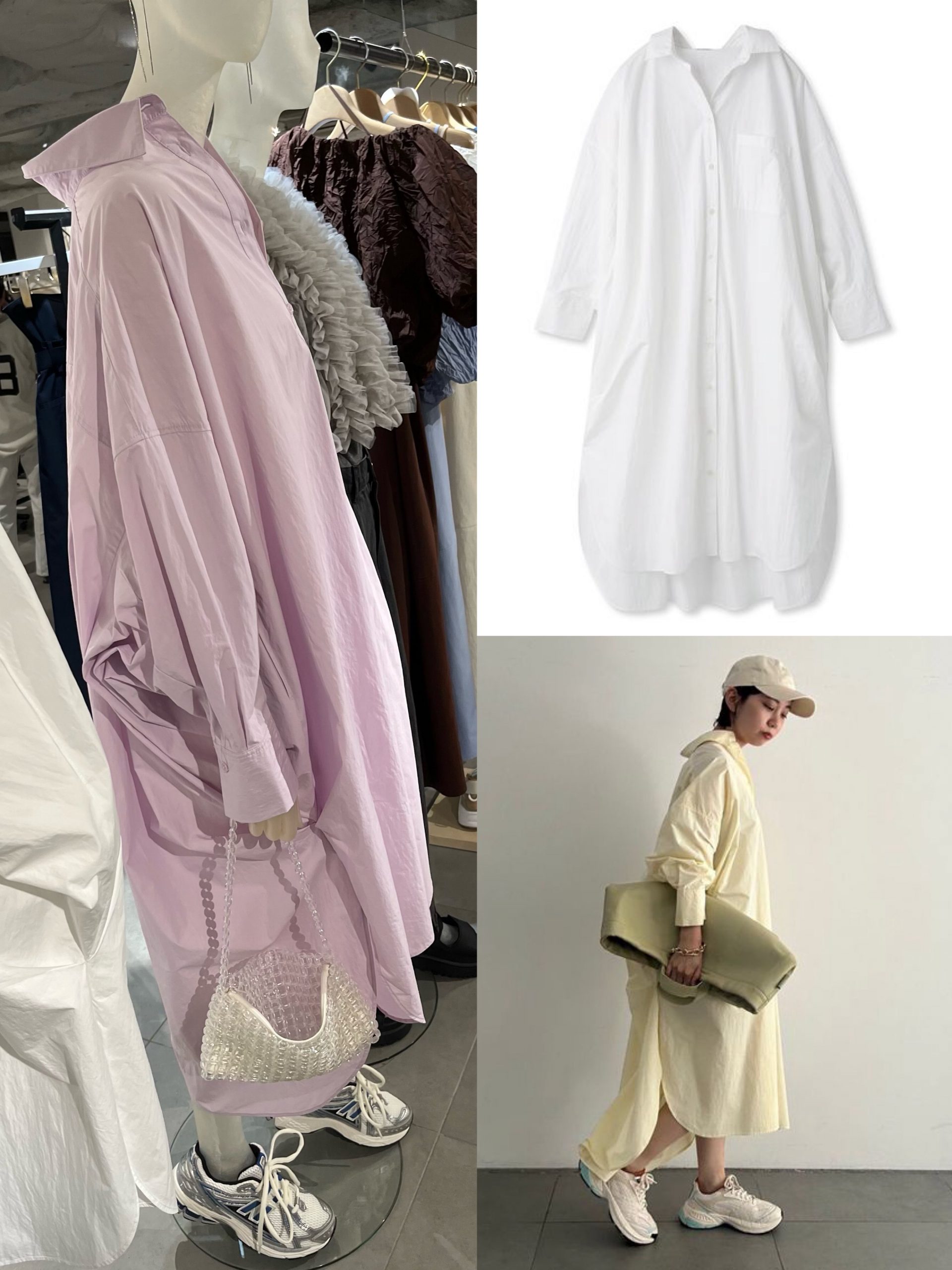 コットンナイロンを使った、ビッグサイズのシャツワンピース。足首くらいまで丈があるので、1枚でさらっと着るのが素敵。スニーカーのボリュームにもピタリとはまります。シワになりにくいのも有難い。ビックシャルワンピース /emmi atelier