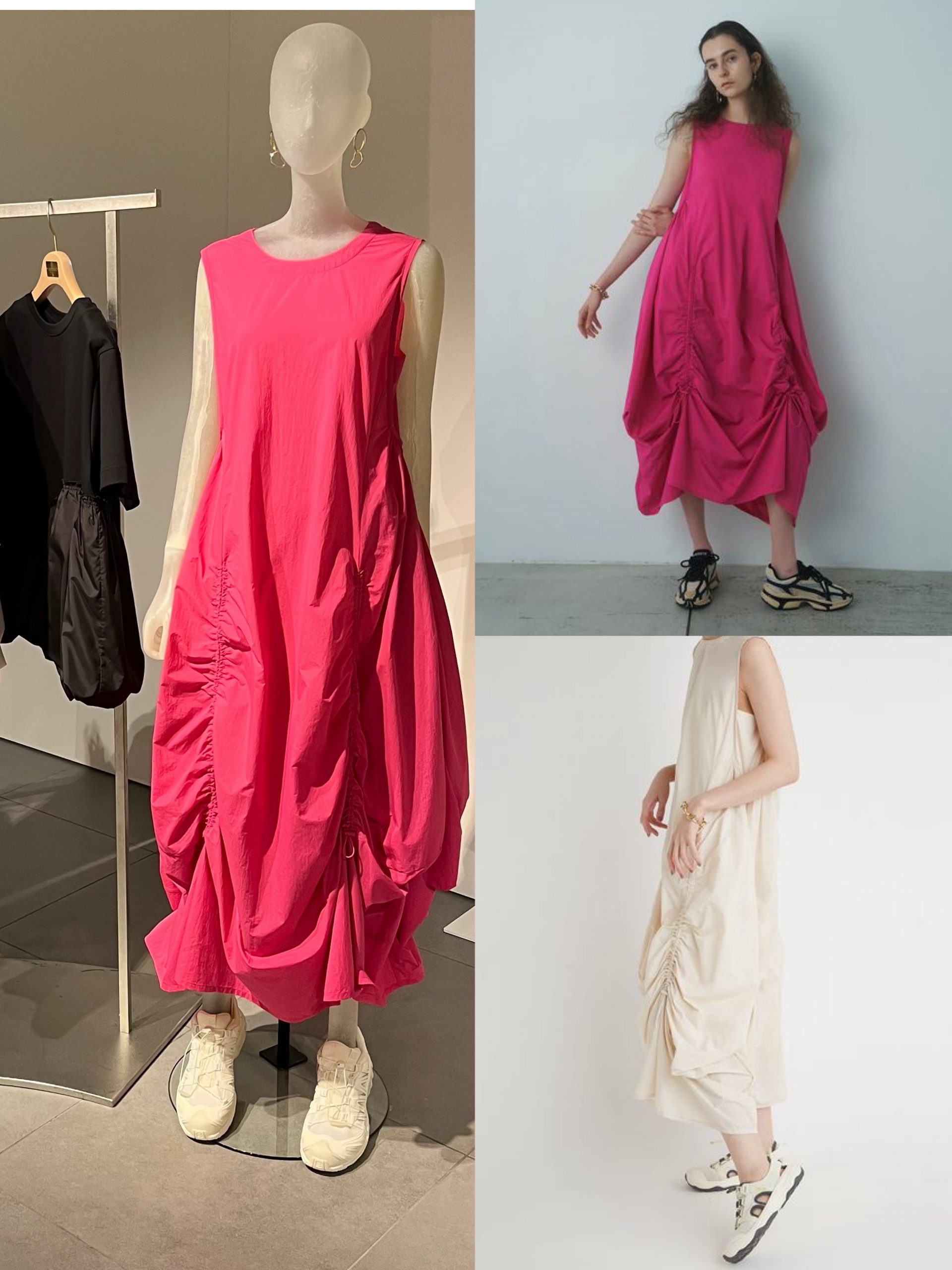 リサイクルナイロンを使った、人気のギャザーワンピース。強めのローズピンクも、大人っぽく着こなせます。リサイクルナイロンギャザーワンピース /emmi atelier