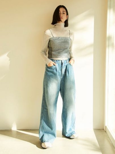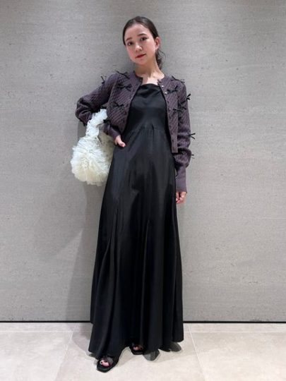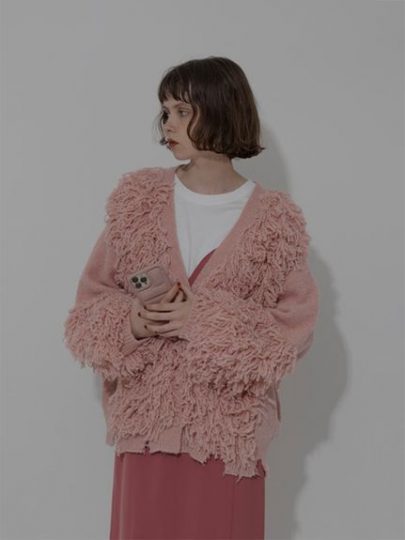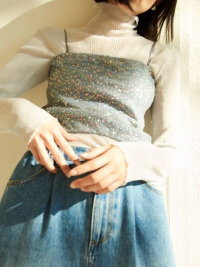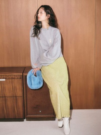 シャイニーなラメ糸をブレンドした華やかなフェザーニットを使用。きらきらがトレンドな今季は、気負わずにデイリーコーデに取り入れてみよう。