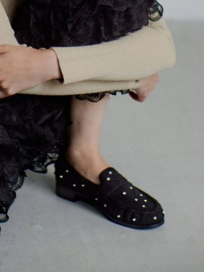 落ち着いた黒のスウェード生地にラインストーンを散りばめた、ヴィンテージ感のあるデザインでこなれ感たっぷりの足元に。