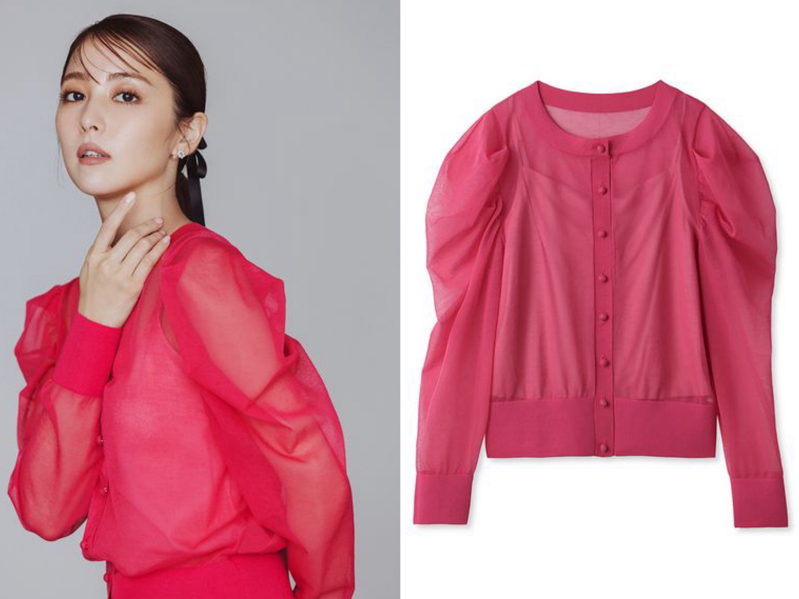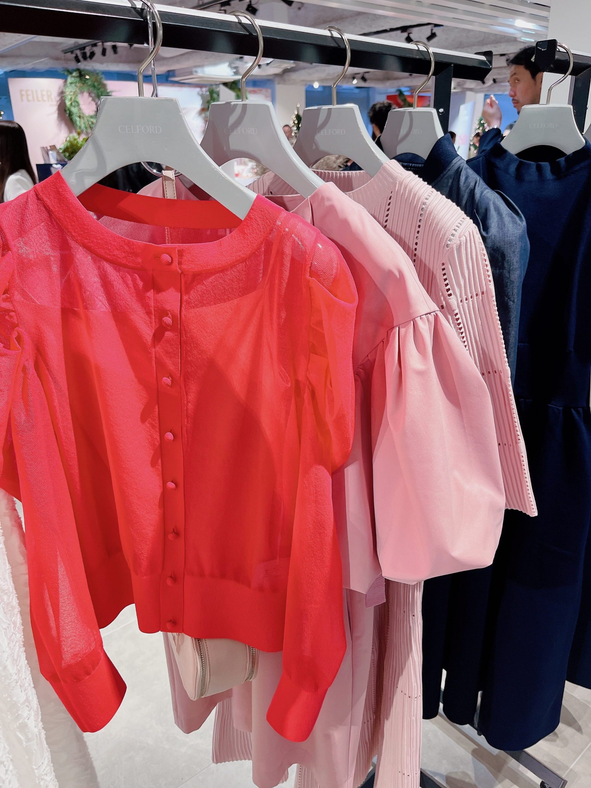 展示会でもひときわ目を引いた、強めピンクなシアーカーデ。桜色のような淡めなピンクが多いCELFORDですが、今年は気分が上がるヴィヴィッドなピンクも揃ってます。