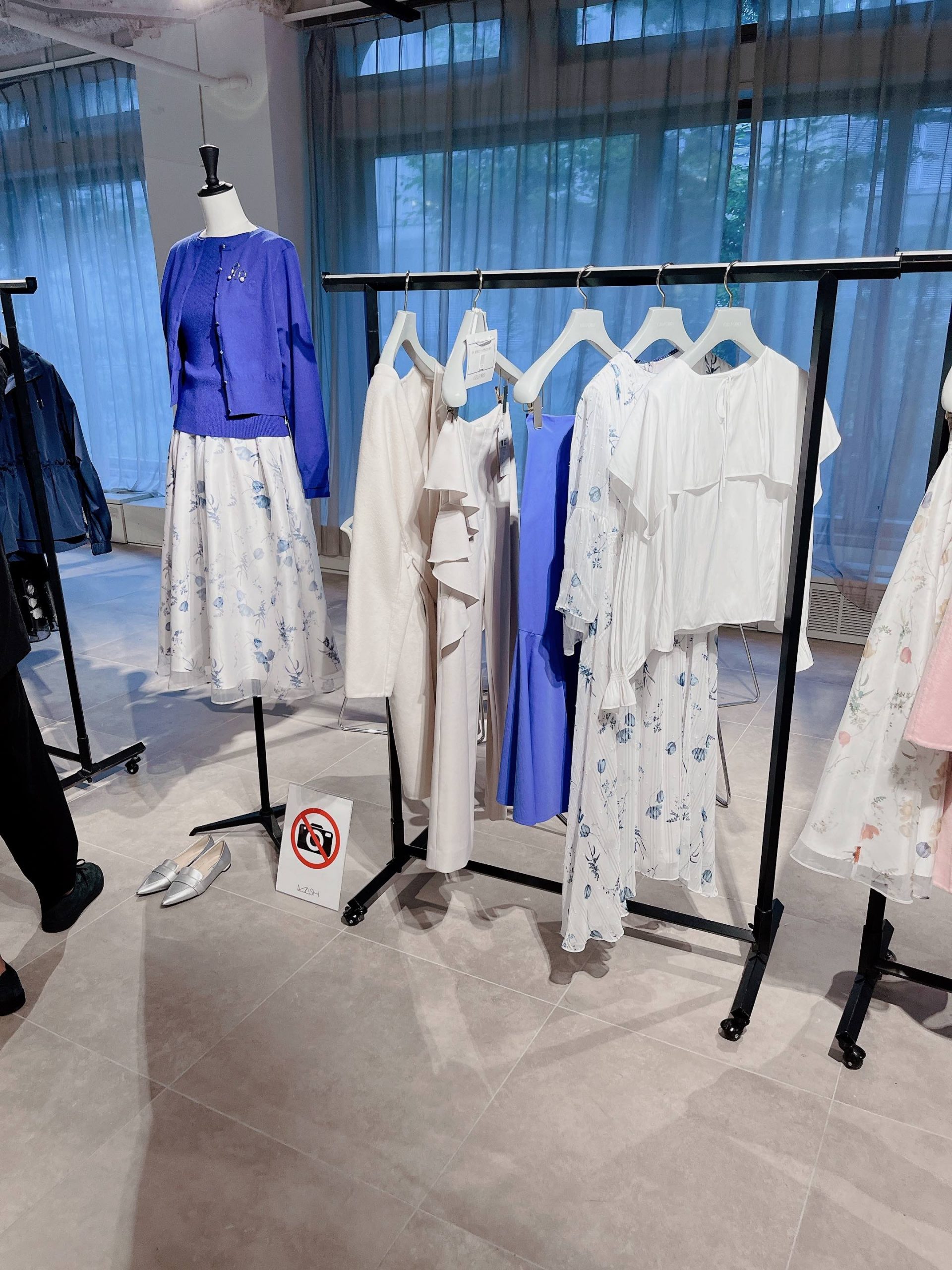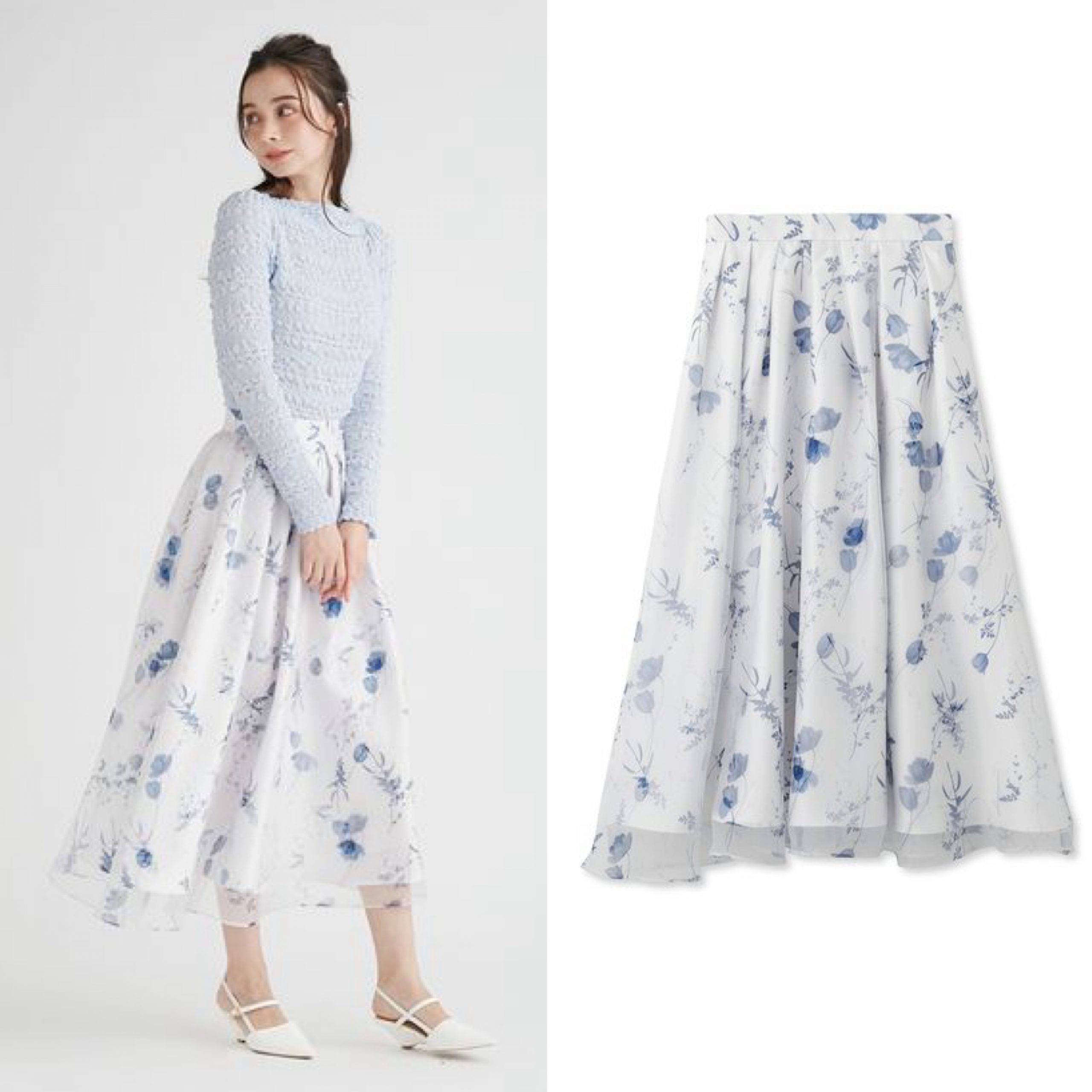 爽やかなブルーカラーから売れていっている、フラワー柄のフレアスカート。繊細なオーガンジーにプリントされた大人っぽい花柄が、本当に素敵。フラワープリントタックフレアスカート/CELFORD