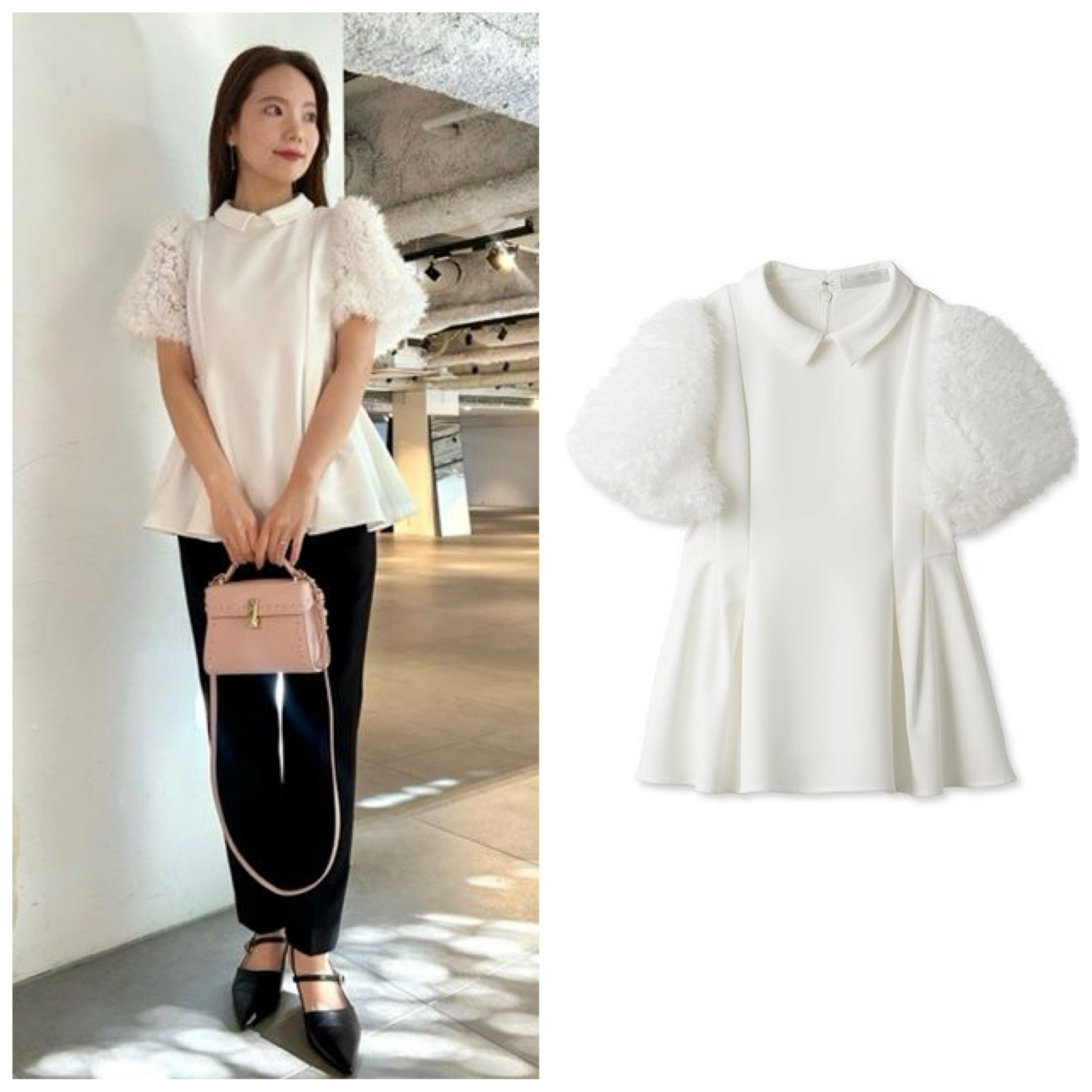 こちらも半袖で、今らか争奪戦になりつつあるフリルの袖がゴージャスなブラウス。やっぱり白が使えそうです。襟付きブラウス/CELFORD