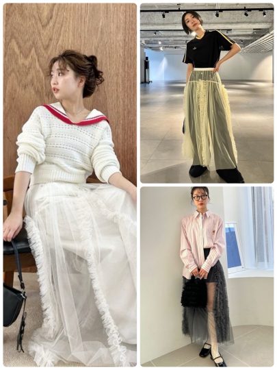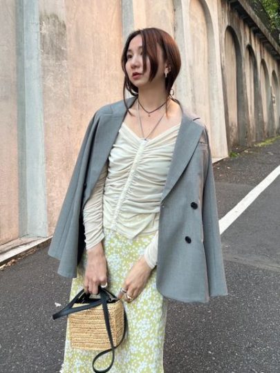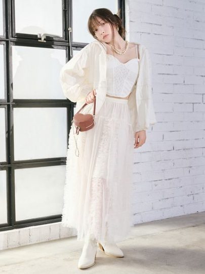 ミニ丈のニットワンピとチュールワンピのセットアイテムで、簡単に今っぽいレイヤードルックに。チュールワンピースは、コルセット風のデザインが印象的。ギャザーたっぷりなスカート部分は歩くたびに美しく揺れます。パフスリーブで品よく見せたリブニットワンピに重ねると、チュールの繊細さが引き立ち、着丈に差をだすことで春っぽい軽やかさを加えました。