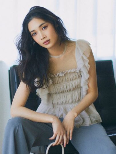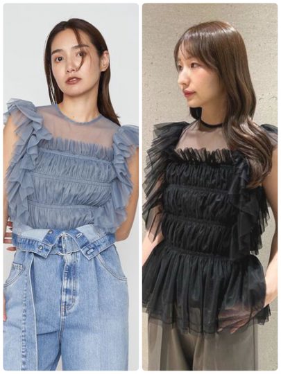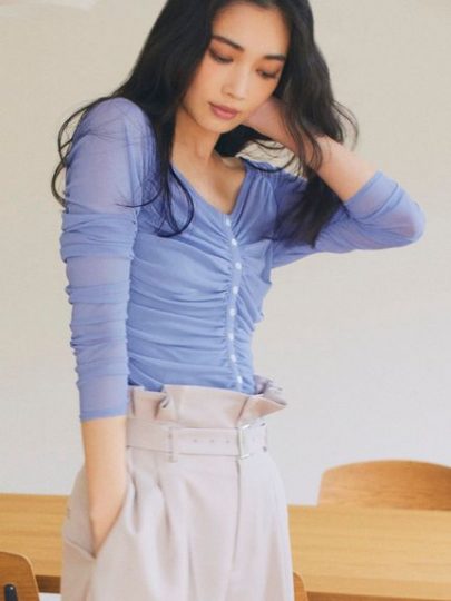 たっぷりとギャザーを寄せたチュールトップス。肩と胸元にフリルが集まるデザインで、デコルテを華奢に、顔まわりを華やかに見せてくれます。ウエストには切り替えを入れてメリハリ感をプラス。