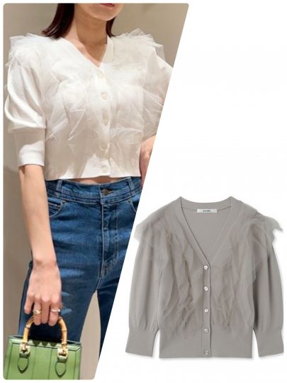 デコルテをきれいに見せるV開きニットカーディガンには、トレンドのチュールフリルを前身頃にふんだんに取り入れて顔まわりを華やかに演出。クロップド丈のコンパクトなシルエットで、旬のハイウエストボトムやボリュームスカートとともバランスが取りやすいデザインです。