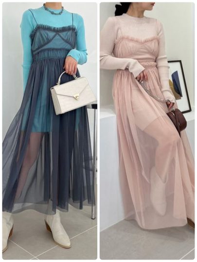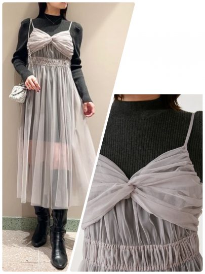 異素材のコントラストとコーデを楽しむ、ニットワンピとチュールワンピのコンビアイテム。チュールワンピにはコルセットディティールを取り入れ、ウエストに細かなギャザーを寄せたロマンティックなデザイン。インナーのニットワンピは細見えするリブ編みで、あえて膝上のミニ丈にすることでチュールから透ける肌のコントラストを楽しめるように計算しています。
