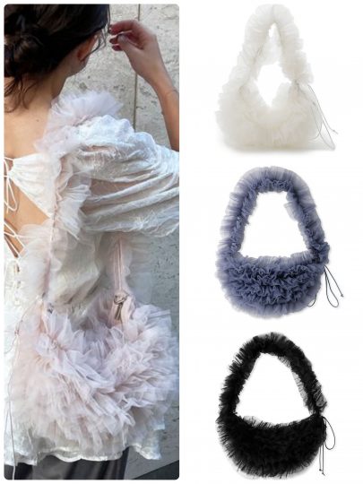 チュールをふんだんに使用したモード感たっぷりのショルダーバッグ。半月型ボディにフリルを贅沢につかい、一点投入で今年顔になれるデザインです。