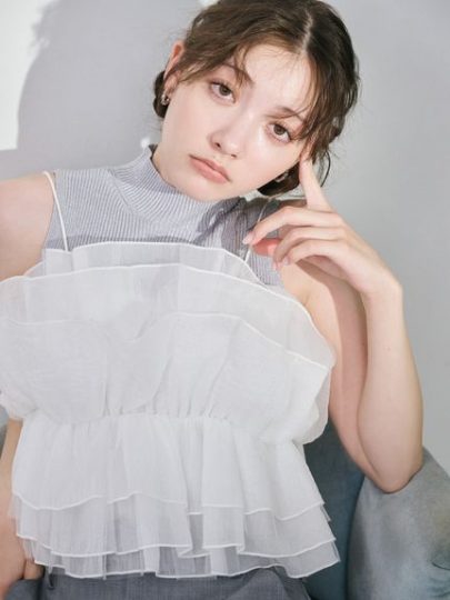 生地を幾重にも重ねてボリュームを出したフリルビスチェ。きらめくシアー素材を使い、生地の間にチュールを挟み込みふんわりボリューミーに。バックスタイルはグログランリボンで結ぶ仕様のため、体型にあわせて調整が可能です。カジュアルなカットソーに重ねたり、デニムなどにあわせた引き算コーデでスタイリングの幅が広がります。