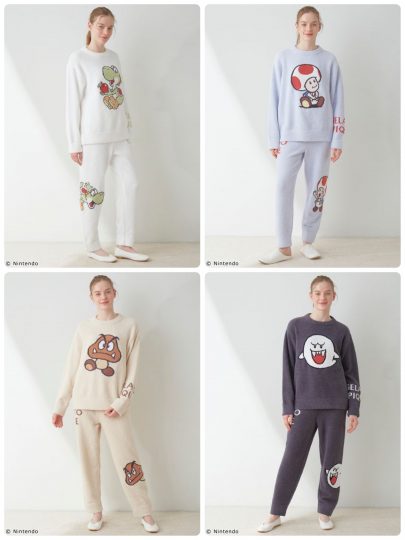 身頃に大きく施されたキャラクターのジャガードが目を惹くプルオーバーとロングパンツのセット。「OWHT(ヨッシー)」「BLU(キノピオ)」「BEG(クリボー)」「CGRY(テレサ)」の4色展開。