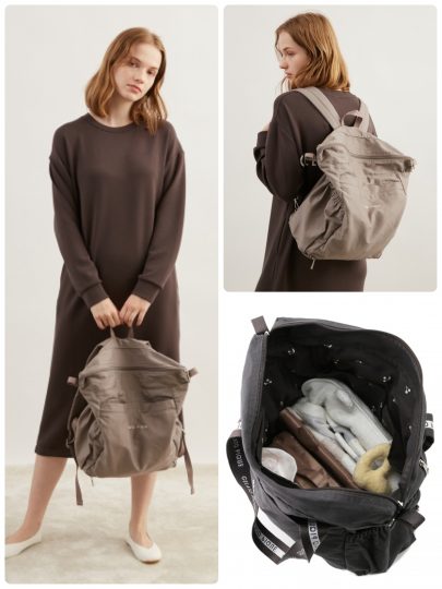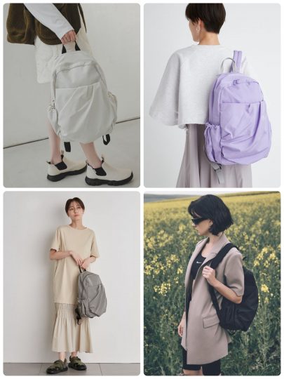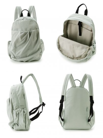光沢感と落ち感がある生地を使い、フロントのギャザーデザインが、こなれ感と愛らしさを演出するポイントに。カラバリ豊富でコーディネートしやすいのも、うれしいポイント。ポケットも充実していて、小さなポケットには鍵をつけられるカラビナが付き。撥水機能も搭載して、デザイン性と利便性を叶えた大人が使えるバックパックです