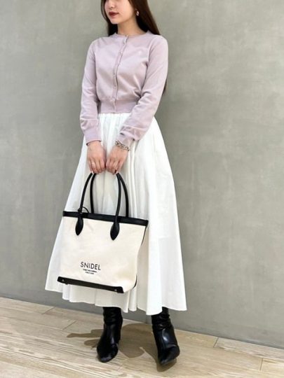 白×ピンクでスウィートムード全開。甘いカラーでもシンプルなアイテムなら、子供っぽくならず大人の装いに。
