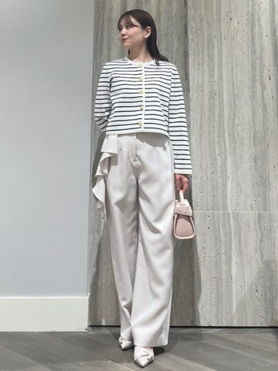 レディなパンツSTYLEはサイドのフリルがポイント。ボトムがシンプルなぶん、トップスに柄物を取り入れて、春らしく華やかに。