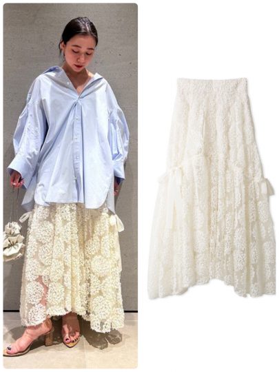 透け感のあるチュール生地を使用したスカートで春を先取り。取り入れるだけで、主役級の華やかさとクリーンさを演出。