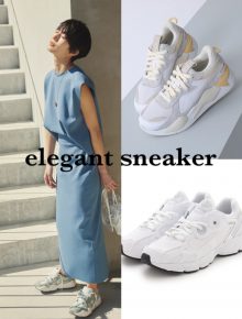 カジュアル一辺倒になりがちなスニーカーも、白をチョイスすればキレイめなコーデに仕上がります。