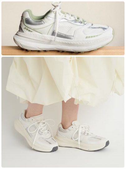 ボリューミーなソールとトレンド感のあるシルバー合皮、メッシュ素材の組み合わせが、足もとへの存在感を引き立たせるモード感あるスニーカー。インソールには低反発素材を使用しており、履き口部分にはしっかり中わたを入れているので、歩いていても靴擦れしにくく歩きやすい仕様です。