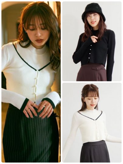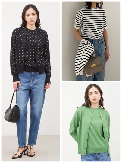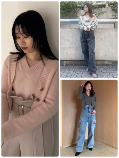 カーディガンを肩掛けしたり、たすき掛けしたりと羽織り方をアレンジすることでまた違った印象に。