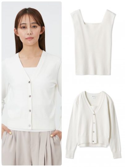 飽きのこないベーシックなアンサンブルニットは、オンオフ問わずに活躍すること請け合いです。シャープなVネックのカーディガンとすっきりしたスクエアネックのタンクのセットで、タンクは肩幅を広くとっているので下着の紐がはみ出す心配もなし。また肩周りをカバーする効果も♡