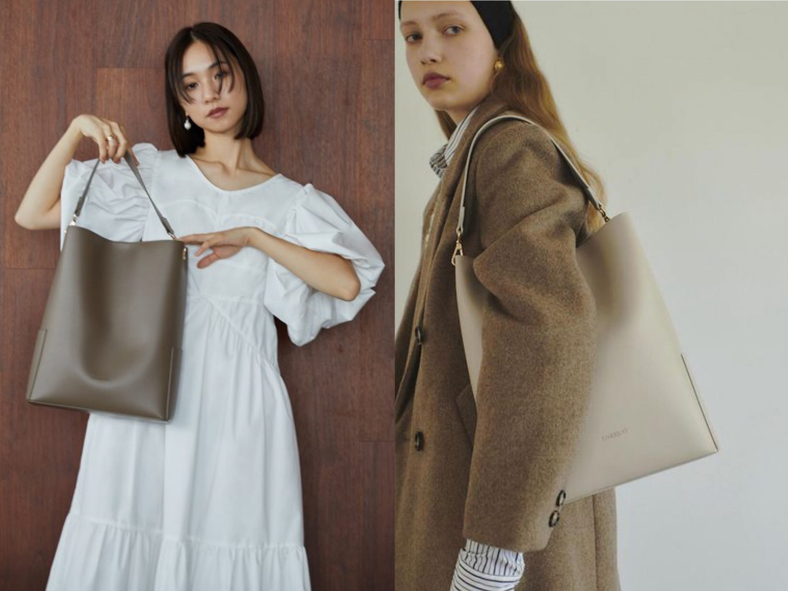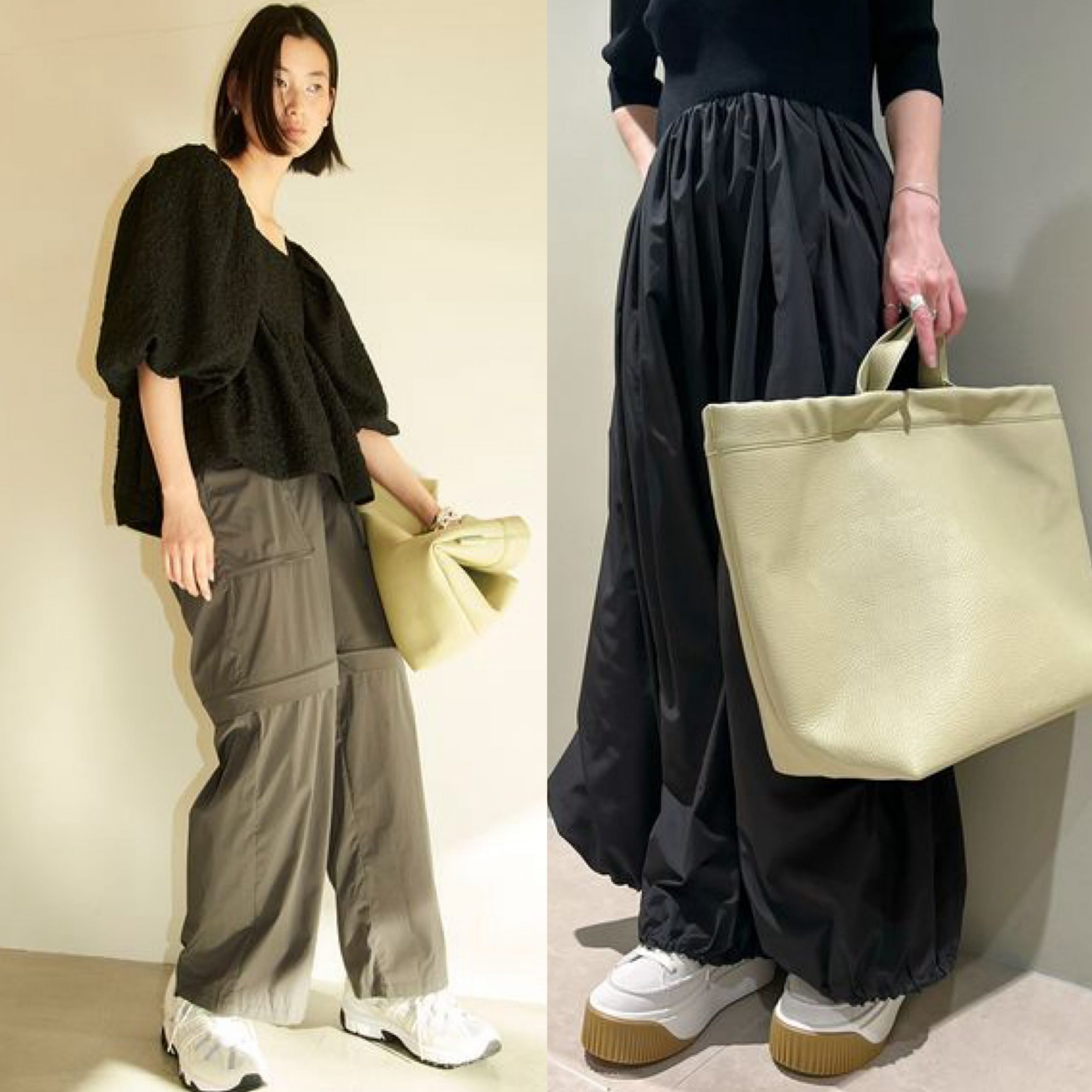 今シーズンは実はビッグサイズのバッグのトレンドが復活すると言われています。早めに購入しておくと、さすがと思われそう。こちらはクシュっと抱えて持つのがおすすめのトートバッグ。【emmi atelier】ラージトートバッグ/emmi