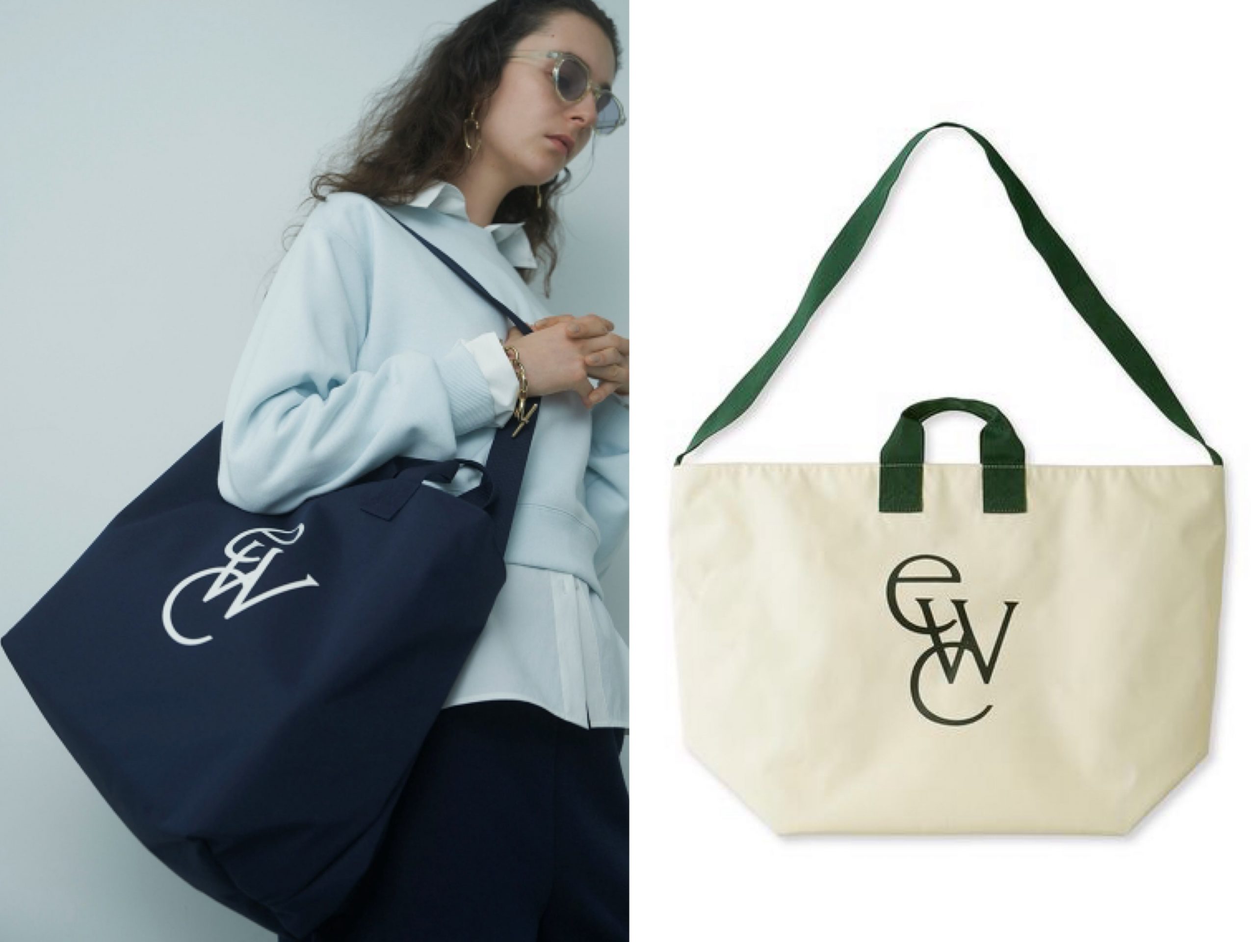 マザーズバッグとしても使いやすい、こちらもショルダー付きの便利なトート。中央のカレッジ風のロゴがポイント。学生さんにもおすすめです。【emmi atelier】ewcトートバッグ/emmi