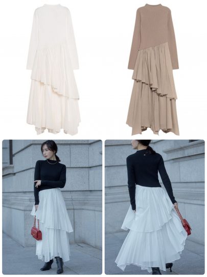 エアリーなスカート部分はアシンメトリーのティアードデザインで、女性らしさのなかにもモードな雰囲気が。ニット部分は伸縮性があり、ほどよいフィット感。