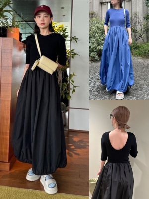 正面から見るとシンプルだけど背中のカットラインが美しい、女性らしさとカジュアルさを兼ね備えたワンピース。異素材MIXで立体的なシルエットも魅力的。黒もブルーも桜のピンクとのコントラストが楽しめそう。