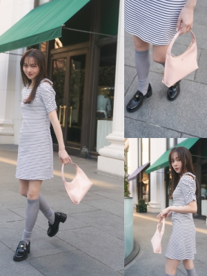 カジュアルとフェミニンの絶妙なバランスを演出したボーダーワンピはお花見デートにぴったり!さりげなくバッグでサクラ色を取り入れてお花見カジュアルを更新!
