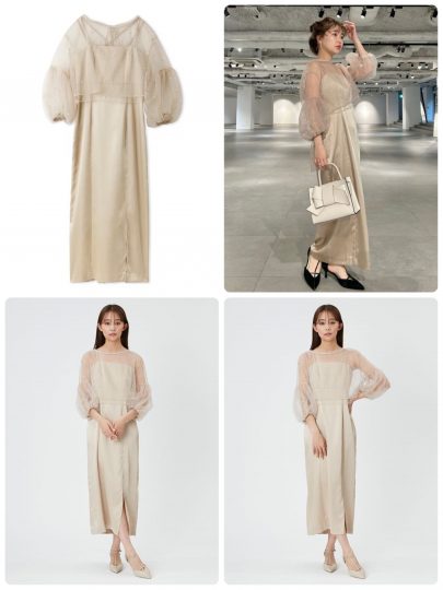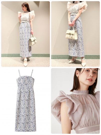 シンプルなサテンキャミドレスと透け感やっぷりのパフスリブラウスのセットです。オケージョンシーンにはこちらのセットのままで、またカジュアルダウンさせるならドレスのインナーにブラウスを着用してみてください。もちろん単品使いして、さまざまなアレンジを楽しむのも◎。