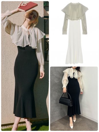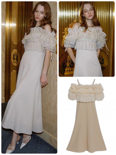 オフショルのギャザーブラウスとシンプルなワンピースのセット。メリハリのあるシルエットを形成してくれるので、スタイルアップにも効果的です。セットで着用していただくと華やかな雰囲気に仕上がりますが、ギャザーブラウス×デニムなどカジュアルアイテムと掛け合わせるのもおすすめ。
