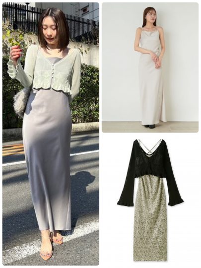 透け感のあるクロシェ風の編み地がポイントのカーディガンとシンプルなサテンキャミワンピのセットアイテムです。両方ともタイトめなデザインで女性らしく着用していただけます。