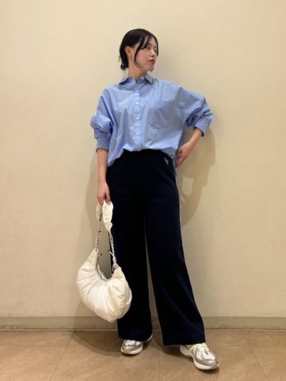 スニーカーで動きやすさを重視したこなれたオフィススタイル。足元がカジュアルな分、トップスはシャツでONモードに。シャツはシワになりにくい素材を採用しているのもうれしいポイント。