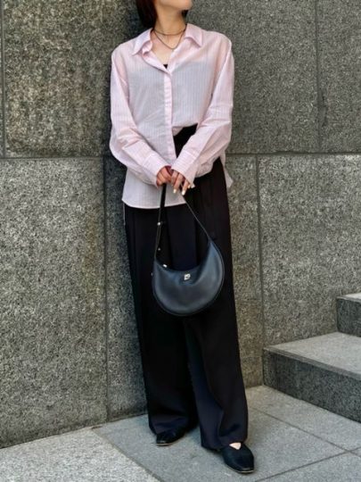 顔まわりが明るい印象になるピンクシャツが主役。ボトムは黒でシックにすれば、カラーを使ったコーデでも子供っぽくならずにオフィスに対応。