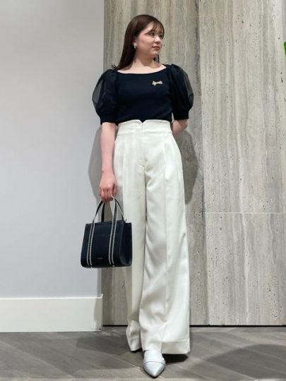 ふんわりとしたパフスリーブで可愛らしさをアピール。甘めのトップスもシンプルなパンツと合わせると、落ち着いたオフィスLOOKに。