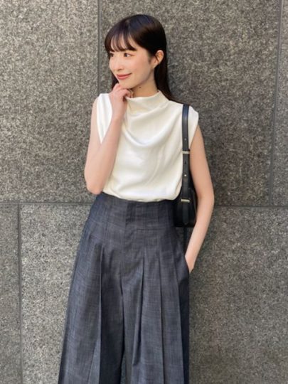 ドレープの入ったトップス×タック入りパンツで、シンプルながらコーデに上品な立体感を与えます。