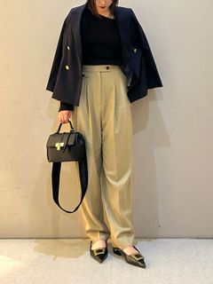 社外の方と会う時は金ボタンのジャケットを羽織って、信頼感と知的さをプッシュ。バッグや靴の小物を黒でまとめると、コーデ全体が引き締まります。