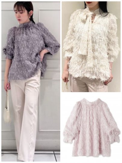クラシカルなブラウスも、インパクトある生地だと途端に今っぽい印象。リボンを結ぶ位置で雰囲気が変わる前後2WAY仕様です。
