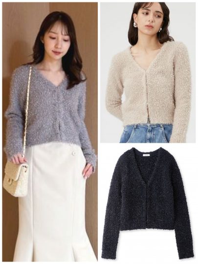 もけもけ素材にさりげなくクリアのフィルムを織り込んだ、大人顔なキラキラニット。Vネックとホック留めでスッキリと。
