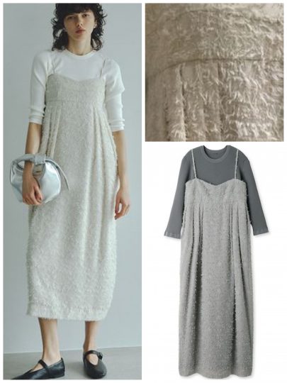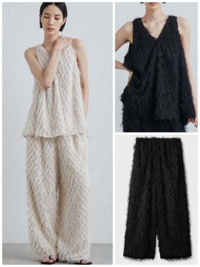 もけもけ素材のセットアップは、ディテールを削ぎ落としたミニマルなデザインで大人っぽく。ウエストゴムのパンツがリラクシー。